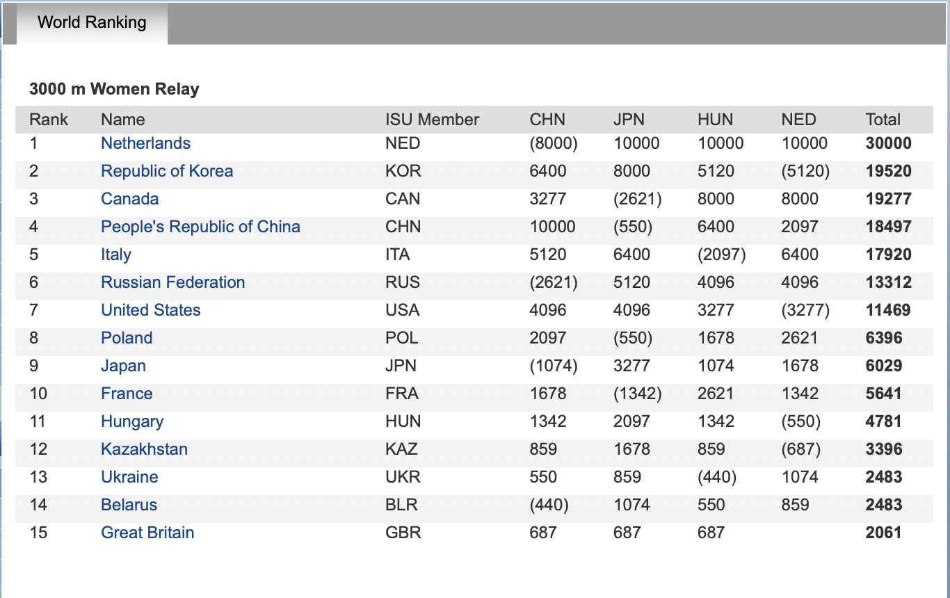 월드컵에서도 1위 네덜란드, 세계랭킹도 역시 네덜란드가1위 입니다. 올림픽 신기록도 세계신기록도 모두 네덜란드 3000m 계주팀이 가지고 있습니다. 근데 재미있는 사실은 2018년에 네덜란드는 금메달을 겨루는 결승A에 올라가지도 못했는데도 결승B에서 올림픽 레코드를 갈아치웠고 더불어서 중국이 실격하면서 네덜란드가 5위가 되어야 하는 상황에 3위로 올라 동메달을 획득하는 행운을 거머쥐었단 사실입니다. https://sports.v.daum.net/v/20180221201132436?f=m