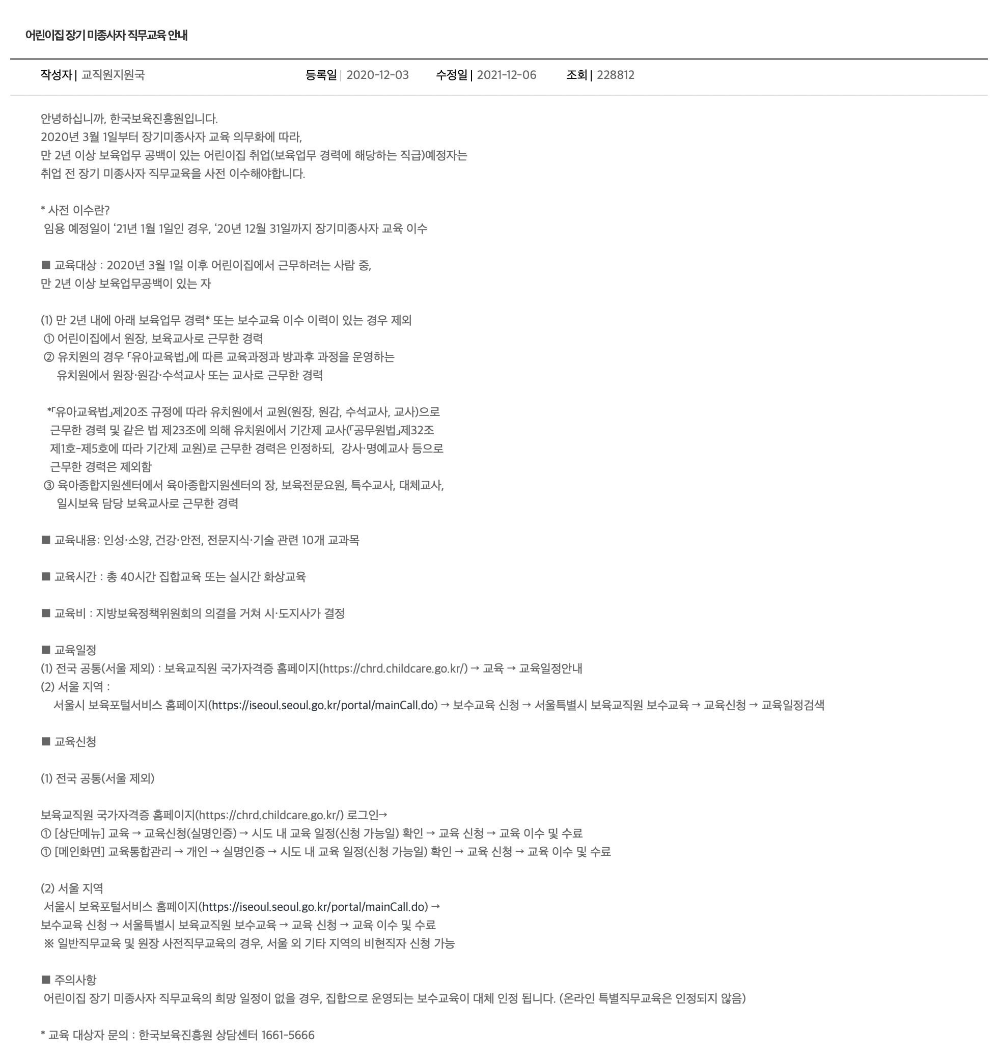 어린이집 장기 미종사자 직무교육의 희망 일정이 없을 경우, 집합으로 운영되는 보수교육이 대체 인정 됩니다. (온라인 특별직무교육은 인정되지 않음)