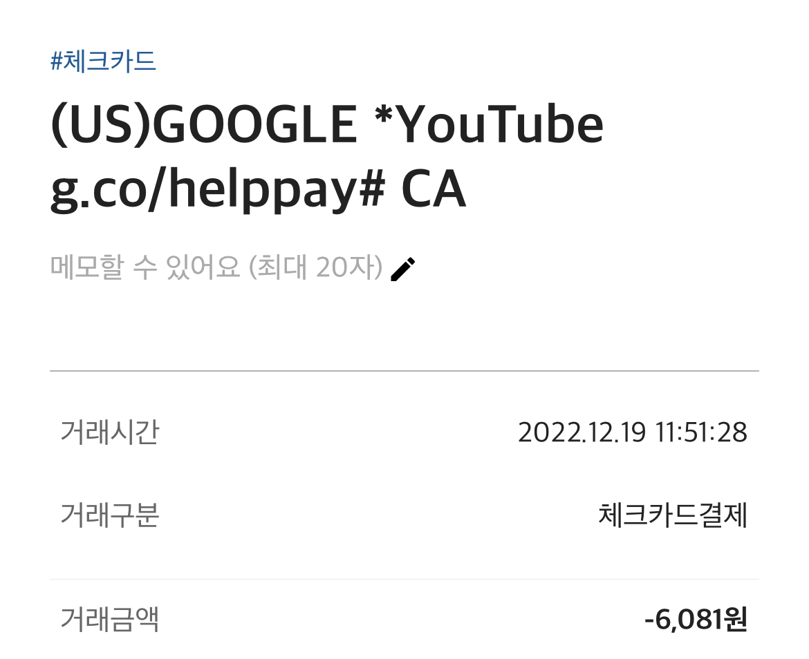 유튜브 아르헨티나가 기존 1.24 US 달러에서 2022년 12월 20일 결제건부터 4.58 US달러로 변경됨. 그리고 기존에 결제등록을 해 놓았던 비 아르헨티나 발급 카드의 경우 대부분 결제거부가 되면서 결