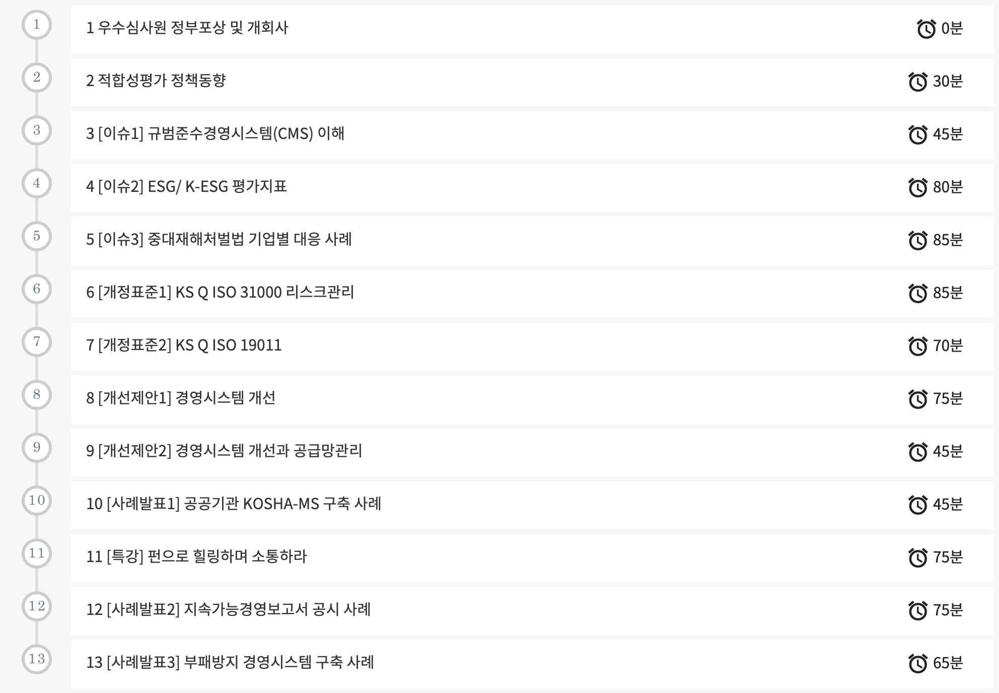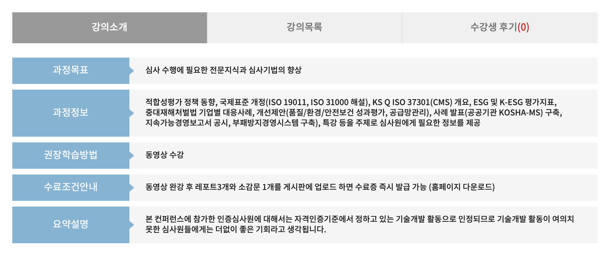 과정정보 - 적합성평가 정책 동향, 국제표준개정, KS Q ISO 370301 개요, ESG 및 K-ESG 평가지표, 중대재해처벌법 기업별 대응사례, 개선제안 (품질/환경/안전보건 성과평가 / 공급망관리), 사례 발표 (공공기관 KOSHA-MS) 구축, 지속가능경영보고서 공시, 부패방지 경영시스템 구축, 특강 등을 주제로 심사원에게 필요한 정보를 제공