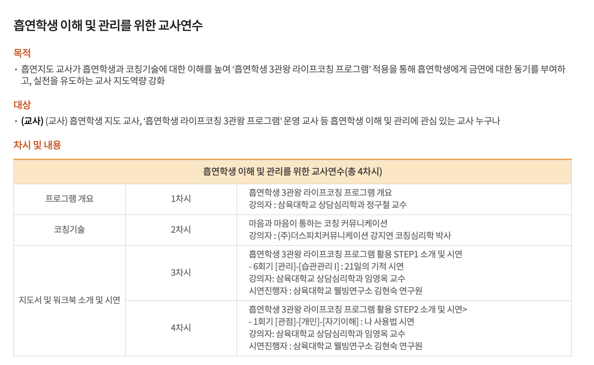 흡연지도 교사가 흡연학생과 코칭기술에 대한 이해를 높여 '흡연학생 3관왕 라이프코칭 프로그램' 적용을 통해 흡연학생에게 금연에 대한 동기를 부여하고, 실천을 유도하는 교사 지도역량 강화